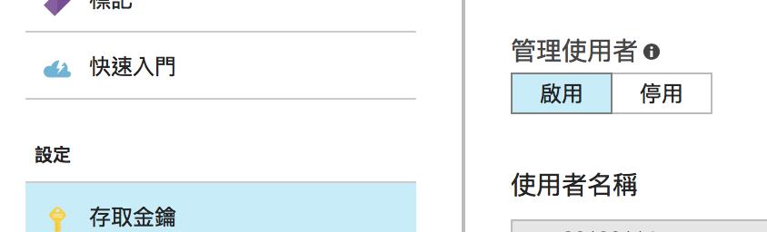 接著讓我們到存取金鑰裡面設定管理使用者帳密