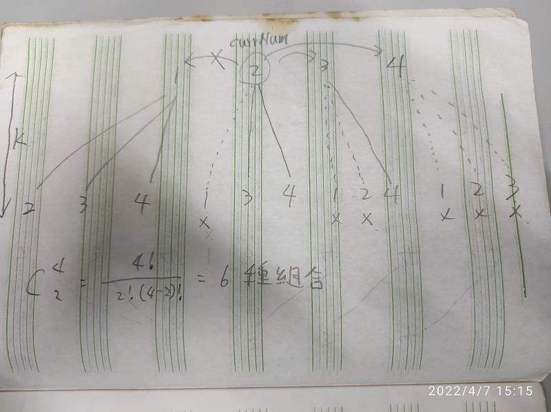 題目為一組 k 的元素,請列出元素值 1 ~ n 之間,可產生多少種組合?
