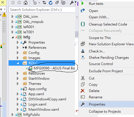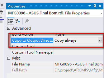 如上圖在MFG0096 - ASUS Final Bom.rdlc 檔案的 右鍵 出現 Proprties 後選 Copy always (如下圖)