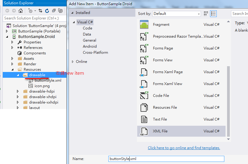 接著在drawable 資料夾右鍵new 一個 item 為 xml file 命名為buttonStyle