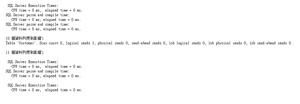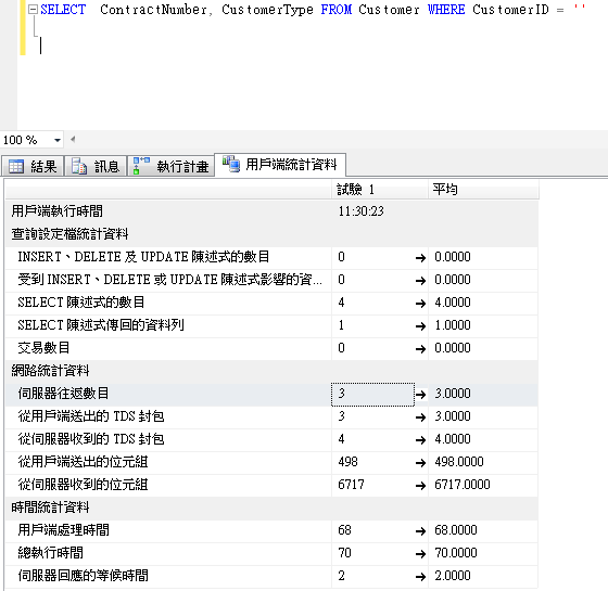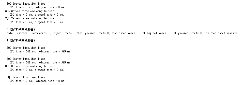 很明顯的看出執行時間變長了,Client與Server間的資料傳送量變高,且邏輯讀取也明顯提高。