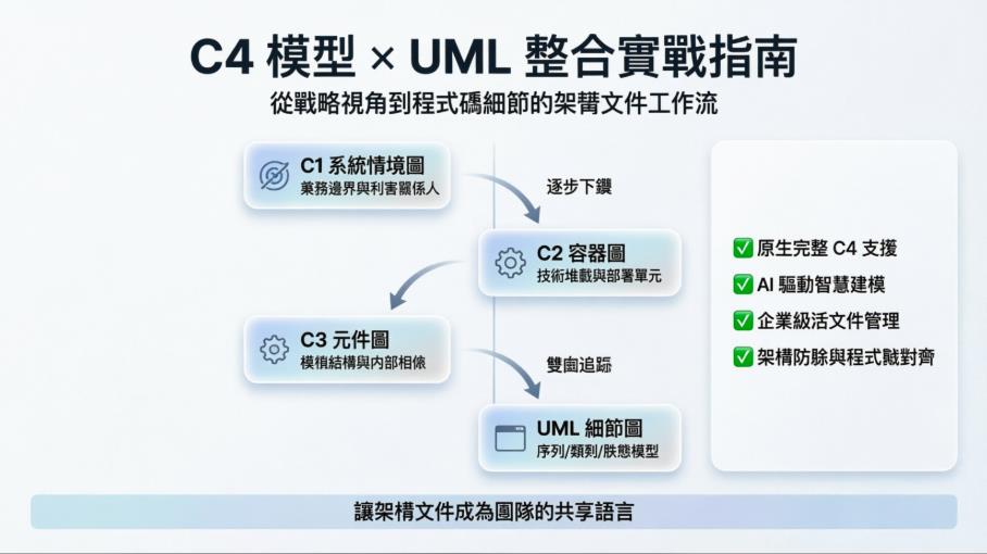 在現代軟體開發中,架構文件常面臨兩大痛點:非技術人員看不懂 UML,開發團隊覺得 C4 缺乏實作細節。C4 模型提供「縮放式」溝通視角,UML 提供標準化建模語言。本文將以 Visual Paradigm 為實作平台,以逐步教學帶領您完成 C4 + UML 整合,並附上深度效益與功能評測