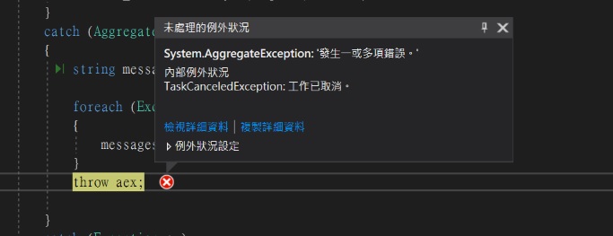 2019-06-18 AggregateException 錯誤 135 0 使用HttpClient呼叫Api時Exception 今天小魯公司網站發生異常,Log顯示一個從未看過的訊息 經後來查詢為API回應時間預設為100秒,若對方處理較久時就會出現該Exception。 目前使用AggregateException額外Catch出來做判斷 回首頁