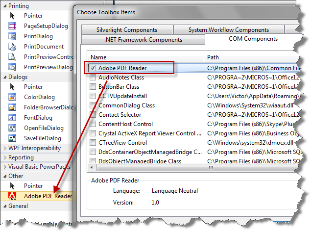 接下來根據上面連結所提到的,在建立UserControler的時候在工具箱當中,要加入Adobe的原件,以方便我們將控制項拖拉到畫面上,這個部分可以在COM頁籤當中找到,像是下圖