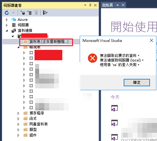 2017-10-13 VS2017 連接 MSSQL 失敗解決方案 253 0 MSSQL 無法擷取此要求的資料 無法連結到伺服器 使用者登入失敗 錯誤訊息 解決辦法 勾起儲存我的密碼 解決方法也是看到參考來源,只是放在第二篇,所以一直錯過 參考來源 http://shaurong.blogspot.tw/2017/03/bug-visual-studio-2017-ide.html 回首頁
