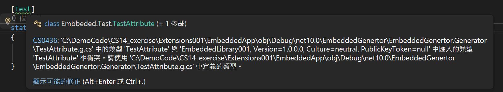 }由於 ProjectA 和 ProjectB 都引用了 MySourceGenerator,所以在兩個專案中都會生成 TestAttribute;而 ProjectB 偏偏又引用了 ProjectA,於是就出現了兩個一模一樣的 TestAttribute。這個現象其實很罕見,在一般的情況下,其實把 TestAttribute 的存取修飾設定為 internal 就沒有問題,但是如果存取修飾非得是 public 或是有 InternalVisibleTo 的情況 ,就會出現 CS0436 的警告。