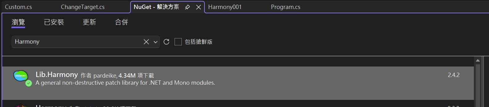 - 透過 Package Manager Console:輸入 Install-Package Lib.Harmony