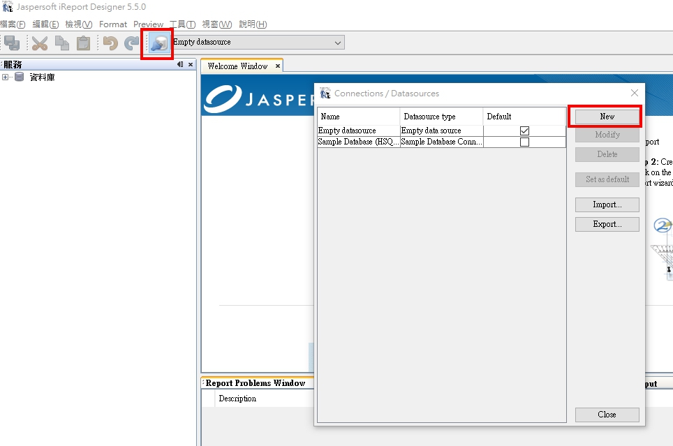 接著點選Report Datasources的按鈕,在彈出的Connections/Datasources視窗中點選New