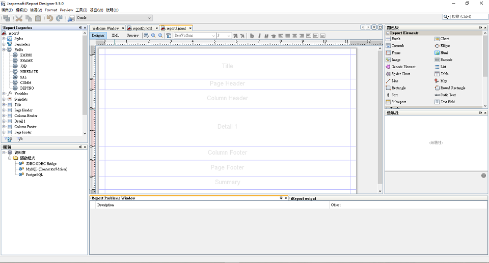 工作上還滿常需要用到iReport來製作一些報表,但都是在前人打好的基礎上再做增修,沒有自己從頭來一遍,總感覺對iReport的理解很有限,所以就藉這個機會在網路上找了一些教學來看,並開這一系列文章來紀錄自己學到了些什麼