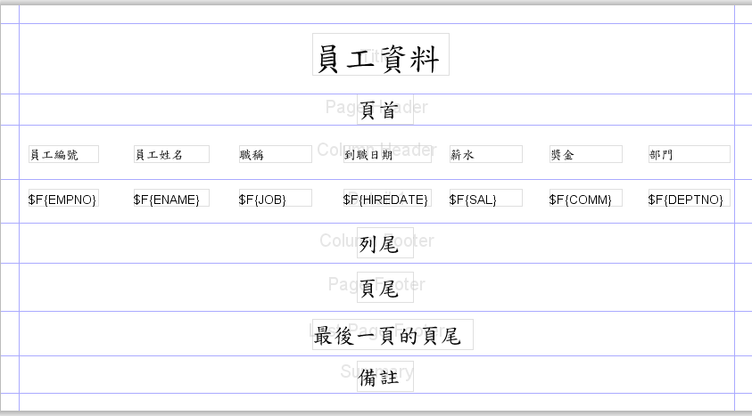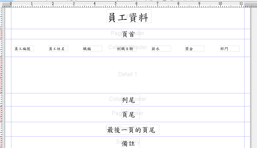 報表被垂直分成多個部分,每個部分稱為Band,在使用上可以自由增加或刪除各個Band,以下針對每個Band做簡略的介紹