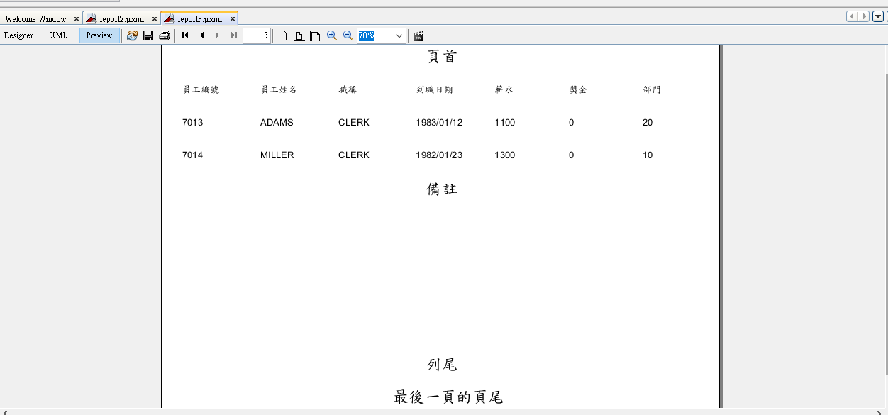 - Summary:出現在報表最後一頁的Detail底下,可以放一些統計的東西