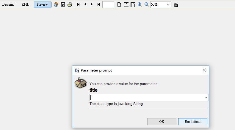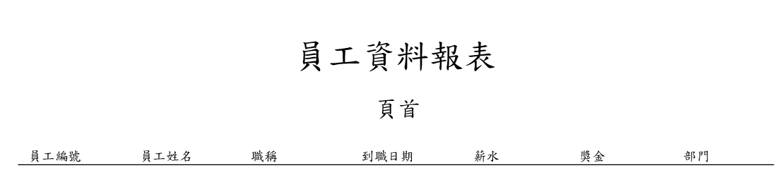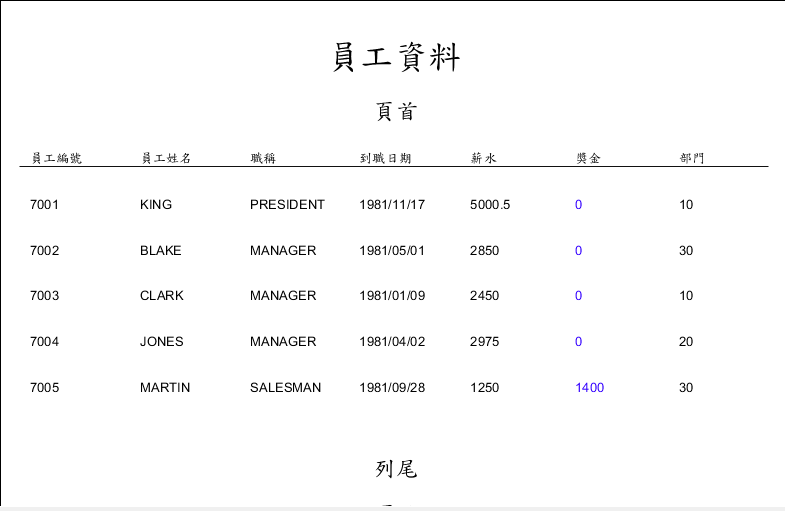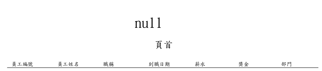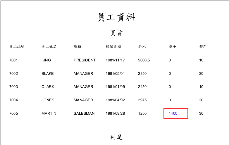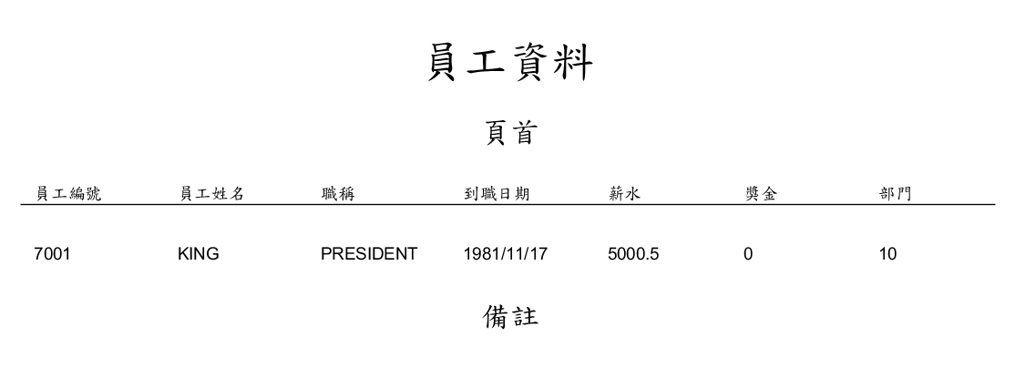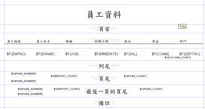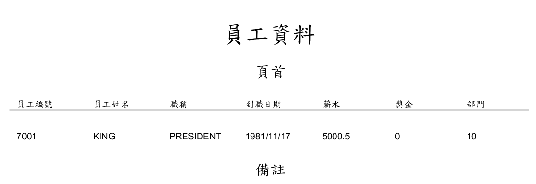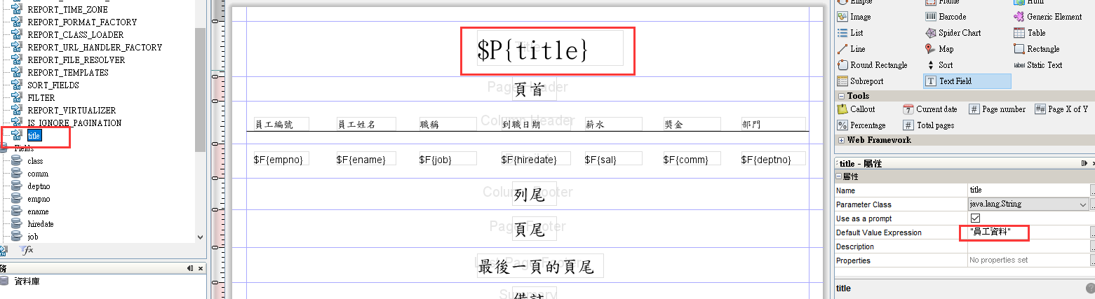 假設新增一個名為title的Parameter,預設值放入"員工資料",接著將原本報表中Static Text的員工資料替代為Text Field的$P{title}