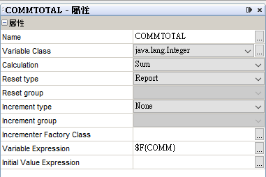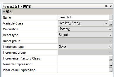 Incrementer Factory Class Name:用來進行計算的一個Java類別,需要實作net.sf.jasperreports.engine.fill.JRIncrementerFactory介面,報表引擎會用它在執行期間根據Variable的Calculation屬性設定來實體化Incrementer物件