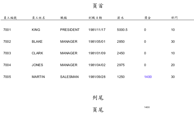 | PAGE_NUMBER | 可以顯示當前所在的頁數,也可以顯示報表的總頁數(根據TextField的evaluationTime屬性設定為Now還是Report決定要顯示什麼) |