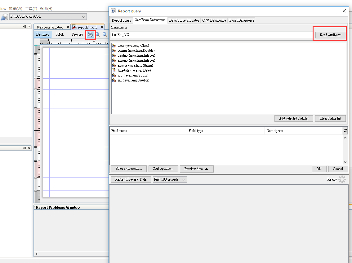 一樣點選Preview旁邊的按鈕,這次選擇JavaBean Datasource,輸入JavaBean類別的完整名稱後按Read Attributes,底下就會出現這個類別所擁有的屬性