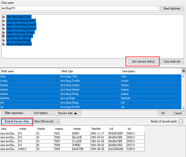 將要加入Field中的屬性選取,點選Add selected field(s),可以看到中間出現剛剛選取的屬性,這時再按Refresh Preview Data,底下就會出現之前在Factory類別中所塞的EmpVO們