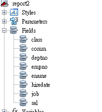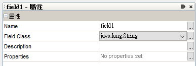 Fields是用來顯示從Dataresource中動態取回來的資料,屬性有Name、Field Class(對應的Java類別)、Description(可選)