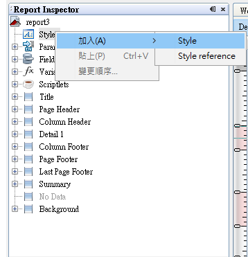 在左邊Report Inspector的最上面可以看到有個「Styles」,對著它按右鍵→加入→Style,接著底下就會出現一個新的Style,右邊的屬性視窗可以對其做修改