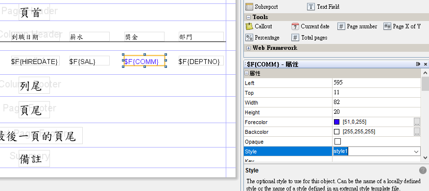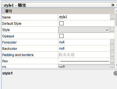 在iReport中可以定義各種樣式並套用在元素上面,以控制元素與外觀相關的一組屬性(顏色、字型...等)