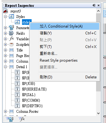 先將style的字體顏色改回來,接著在左邊Report Inspector找到剛剛新增的Style,對其按左鍵→加入Conditional Style,加入後可以在右邊看到它的屬性