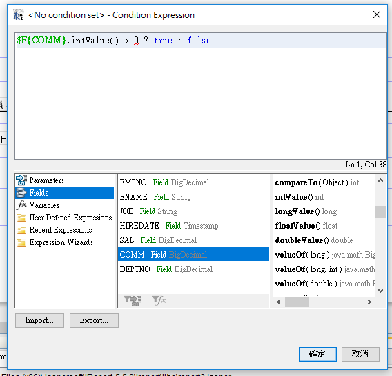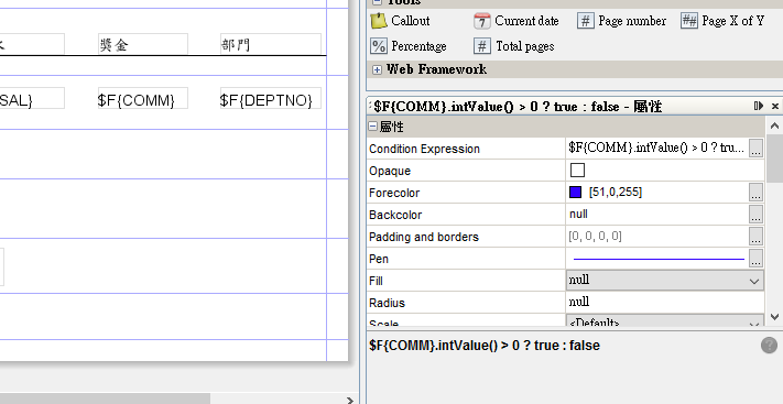 透過設定Condition Expression來控制要在什麼時候套用該樣式,以剛剛的需求來講,輸入$F{COMM}.intValue() > 0 ? true : false