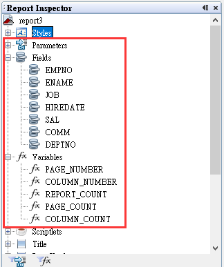 在Report Inspector可以看到目前有定義的Parameters,在報表中可以用$P{Parameter name}來取得值
