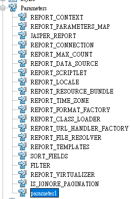 Parameters通常是從外部傳入的一些參數,可以用在報表的標題字串、或是在SQL中的查詢字串......等等,每個Parameters對應的類型也是一個Java類別