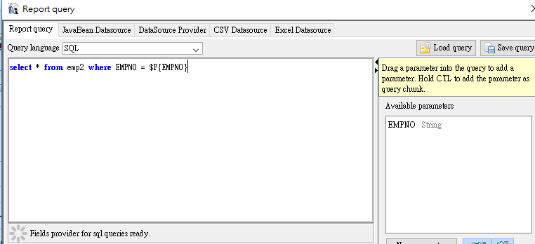 新增一個名為EMPNO的Parameter,接著點開Report query的畫面,將SQL指令改成select * from emp2 where EMPNO = $P{EMPNO}