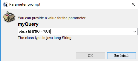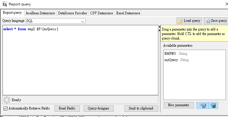 此外也可以把Parameter當做一整個where的查詢條件,例如新增一個名為myQuery的Parameter,接著點開Report query的畫面,將SQL指令改成select * from emp2 $P!{myQuery}