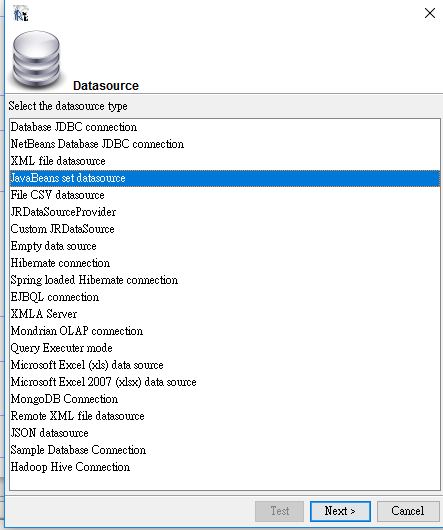 接著如上一篇文章所提到的步驟,在Classpath加入.class檔所在的位置(比如說D:\jdk7work\JavaBean\bin),接著新增Datasource,不一樣的是這次要選擇「JavaBeans set datasource」