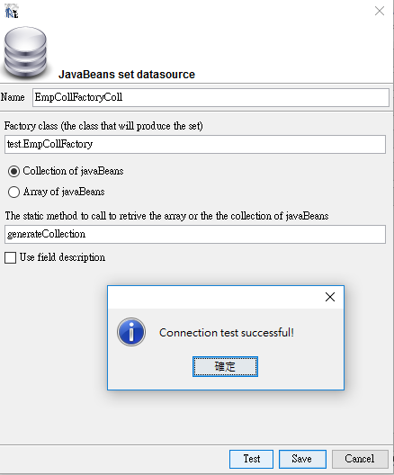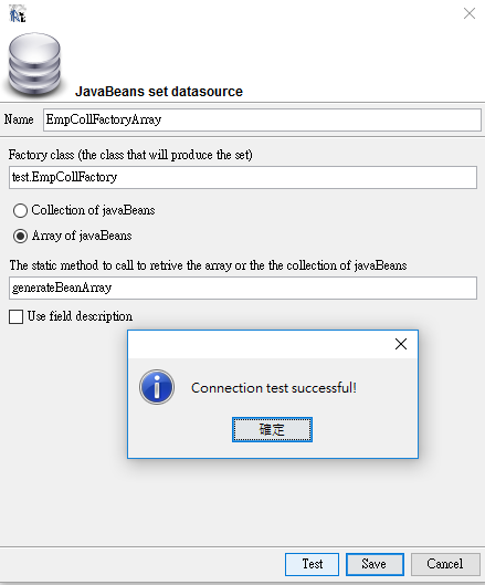 Factory class:Factory類別的完整名稱,預設是com.jaspersoft.ireport.examples.SampleJRDataSourceFactory,用這個也可以,但在預覽的時候看不到實際的資料