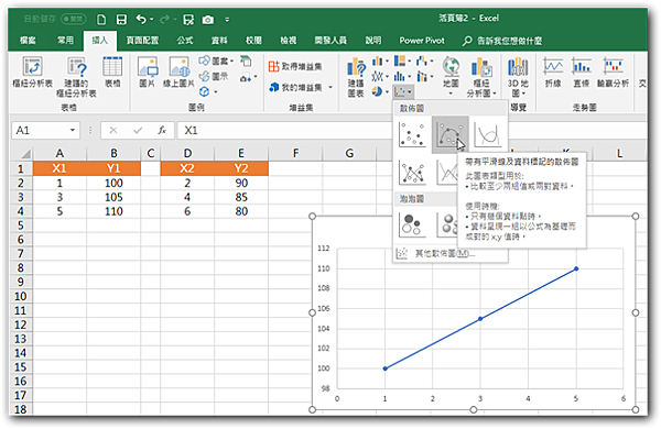 步驟2:框選A1:B4儲存格範圍,再點取「插入 > 插入XY散佈圖或泡泡圖 > 帶有平滑線及資料標記的散佈圖」圖示。