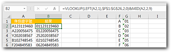 4.VLOOKUP(LEFT(A2,1),$F$1:$G$26,2,0)&MID(A2,2,9) 將3.與1.的結果相結合。