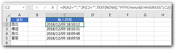 點取C2儲存格輸入公式「=IF(A2="","",IF(C2="",TEXT(NOW(),"YYYY/mm/dd HH:MM:SS"),C2))」後,按Enter鍵完成輸入,再向下複製到C3:C11儲存格(視需要增加列數)。