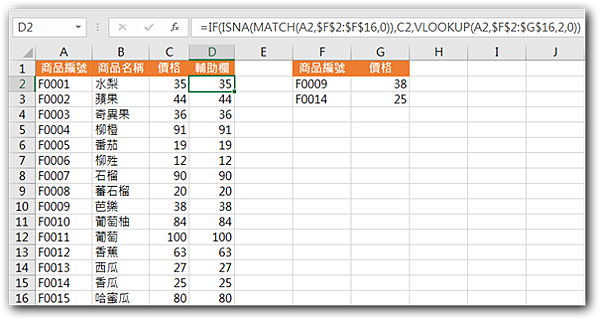 點取D2儲存格輸入公式「=IF(ISNA(MATCH(A2,$F$2:$F$16,0)),C2,VLOOKUP(A2,$F$2: $G$16, 2,0))」後,按ENTER鍵完成輸入,再複製到D3:D16儲存格。