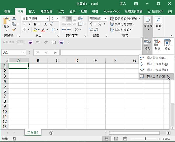 2.點取一個工作表標籤,再點取「常用 >儲存格 > 插入」下拉方塊,在彈出的下拉清單中選擇「插入工作表」選項,如下圖所示。
