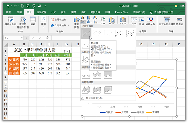 點取「插入 > 折入折線圖或區域圖右方▼鈕 > 折線圖」圖示。