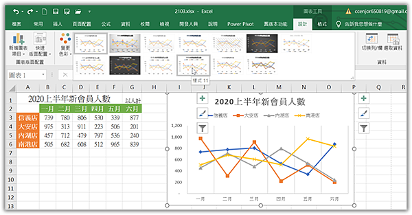 若要改變這樣的狀況,只要點取「圖表工具/設計 > 樣式11」圖示,讓折線圖中各條折線套用不同標記,就算印成黑白的也不用擔心了。