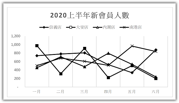 折線圖上可以看出信義店和南港店的新增會員數比較多,大安店和內湖店比較少。不過,有時折線圖的線一多,顏色會混在一起很難區別,或者圖是彩色的,但是印成紙本時候變成黑白的,每條線看起來都一樣了。