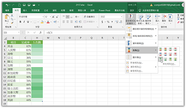 點取「常用 > 設定格式化的條件右邊▼鈕 > 色階 > 綠-白色階」圖示。