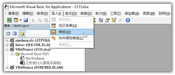 點取「插入 > 模組」指令,新增一張空白模組工作表。