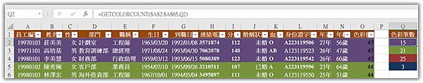 在儲存格Q2中輸入公式=GetColorCount($A$2:$A$65,Q2),也就是說需要在A2:A65這個範圍找到與Q2儲存格填滿色彩相同的儲存格數量。