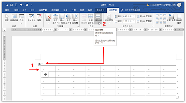 將游標定位於表格第一列的任意一個儲存格,點取「表格/版面配置 > 分割表格」圖示,即可在表格的上方插入空白列。