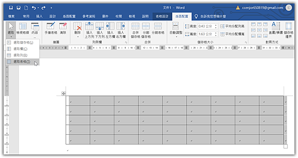 點取表格任一儲存格,再點取「表格/版面配置 > 選取▼鈕 > 選取表格」指令,或是點取表格左上角 鈕,選取整個表格。