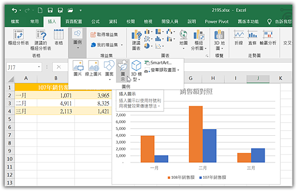 2、點取「插入 > 圖例▼鈕 > 圖示」圖示