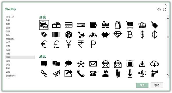 3、在【插入圖示】對話方塊,點取「商務」項目。
