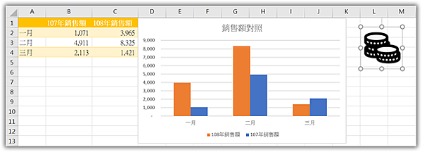 6、按Ctrl+X鍵剪下貨幣圖示,在圖表中選擇一個資料數列,按Ctrl+V鍵貼上貨幣圖示,貨幣圖示將替換圖表中的矩形。