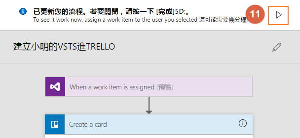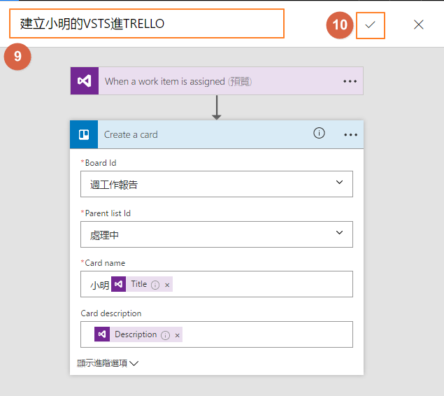 Step6.設定進入Trello的資訊,比較特別的地方是因為上面的事件是AssignTo某個帳號也就是這個流程只For某個人用,因此這個Assign應該是某個團隊的成員,也可以在Trello卡片中知道這個卡片是誰的戰績