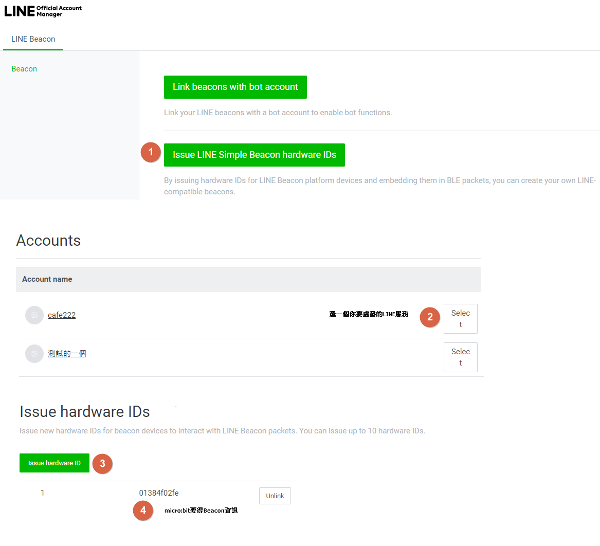 https://manager.line.biz/beacon/register (產生hardware IDs)