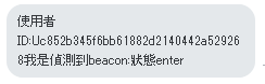 this.ReplyMessage(LineEvent.replyToken, "使用者ID:" + LineEvent.source.userId + "我是偵測到beacon:狀態" + LineEvent.beacon.type);